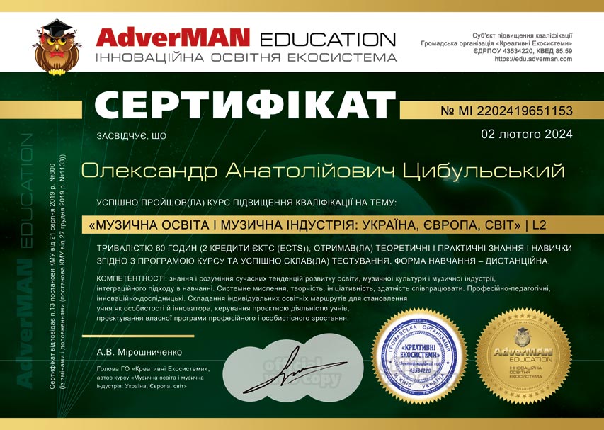 Це сертифікат курсу підвищення кваліфікації педагогічних та науково-педагогічних працівників закладів мистецької освіти "Музична освіта і музична індустрія: Україна, Європа, світ" обсягом 60 годин (2 кредити ЄКТС). Курс діє постійно, працювати з його матеріалами Ви можете в будь-який зручний час. Програма і заявка тут.