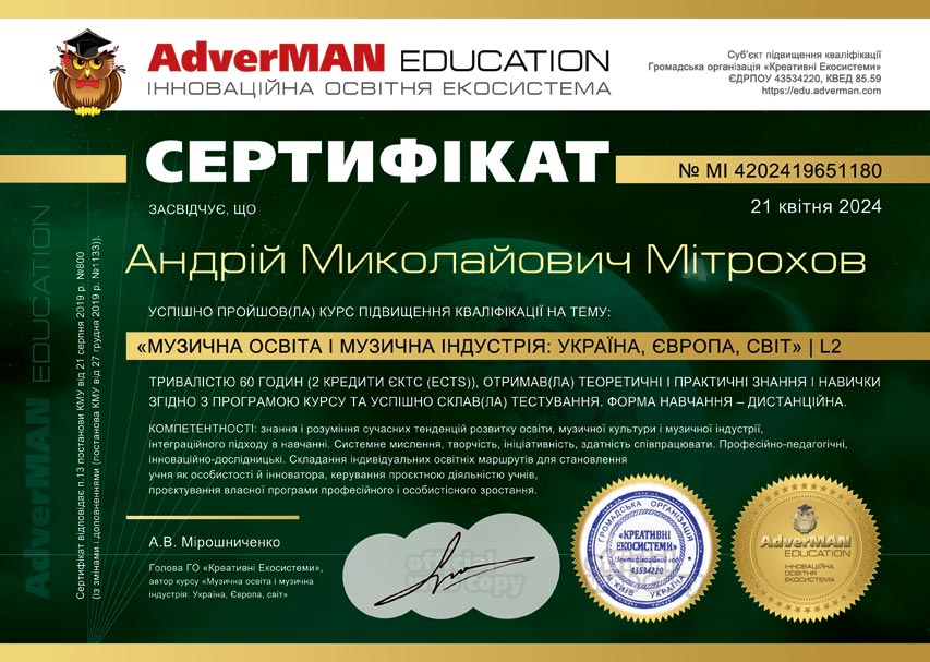 Це сертифікат курсу підвищення кваліфікації педагогічних та науково-педагогічних працівників закладів мистецької освіти "Музична освіта і музична індустрія: Україна, Європа, світ" обсягом 60 годин (2 кредити ЄКТС). Курс діє постійно, працювати з його матеріалами Ви можете в будь-який зручний час. Програма і заявка тут.