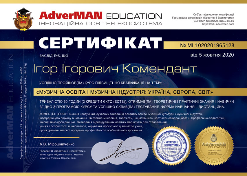 Це сертифікат курсу підвищення кваліфікації педагогічних та науково-педагогічних працівників закладів мистецької освіти "Музична освіта і музична індустрія: Україна, Європа, світ" обсягом 60 годин (2 кредити ЄКТС). Курс діє постійно, працювати з його матеріалами Ви можете в будь-який зручний час. Програма і заявка тут.
